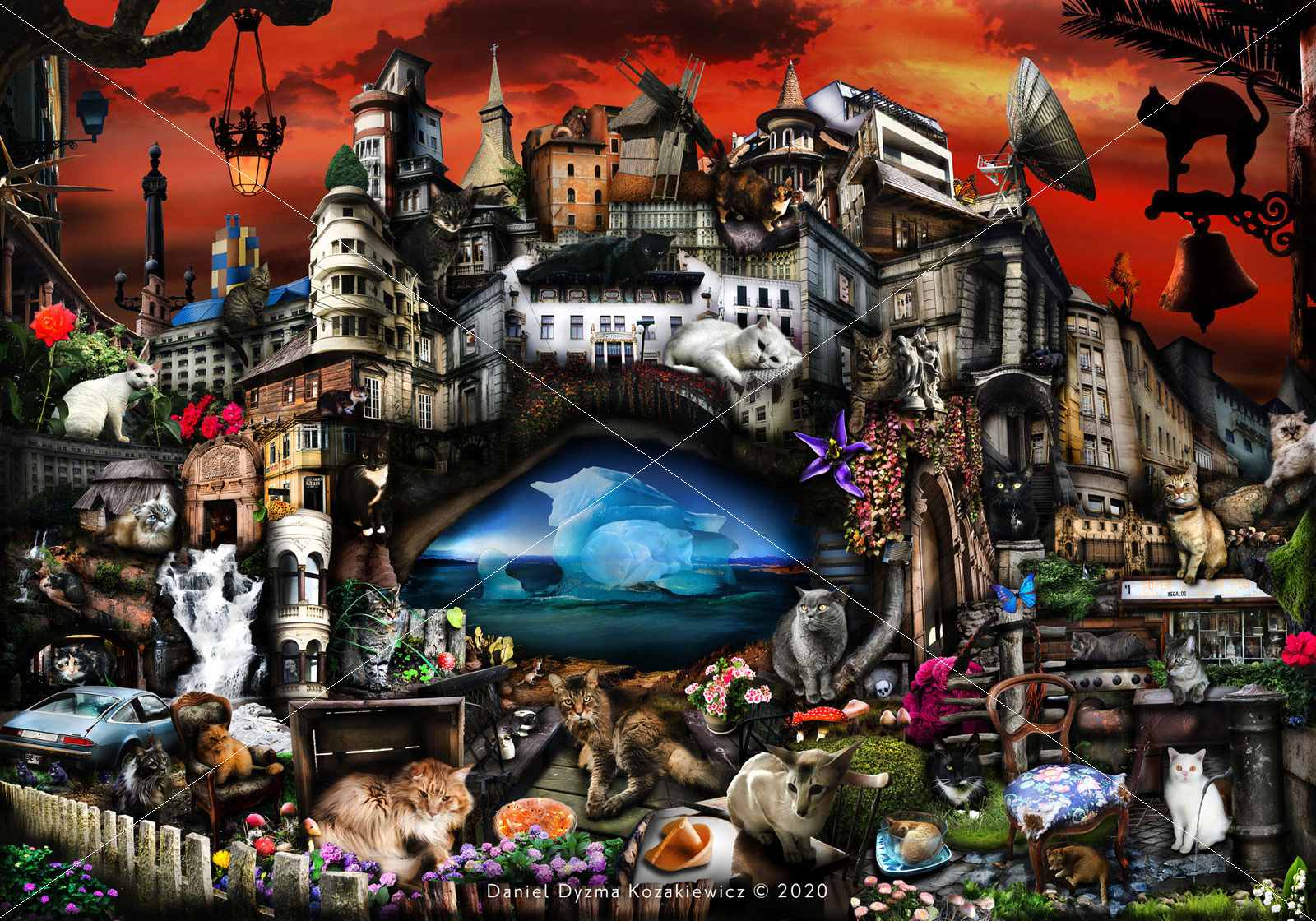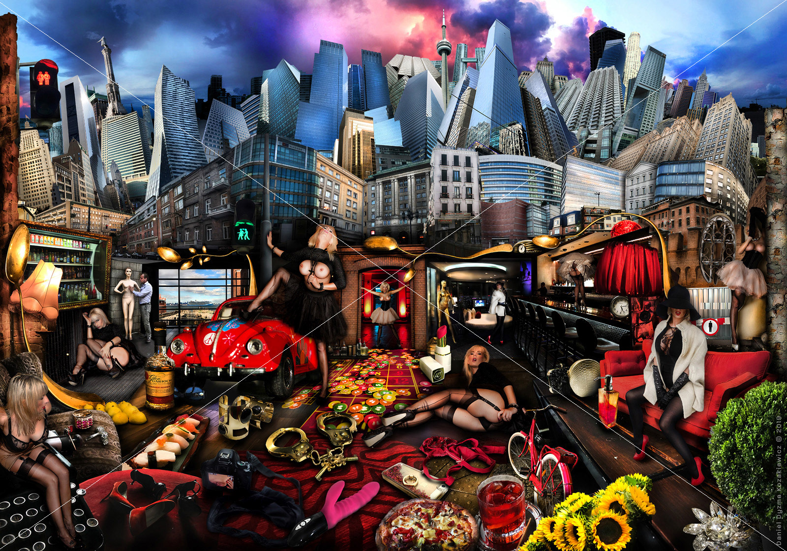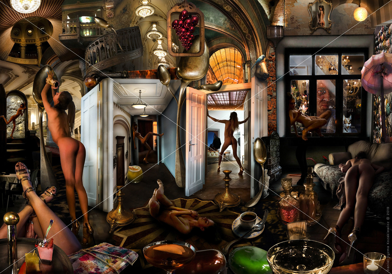 Kolaże cyfrowe. Drukowane na papierze artystycznym tuszami mineralnymi. Edycje limitowane i sygnowane. 100 x 70 cm.